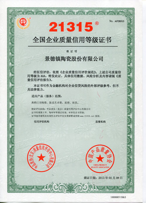 复审通过企业上报复审资料、中品质协质量信用评估中心有限公司进行质量信用等级评估,并出具质量信用等级评估报告,专家最终审核三项程序,最后得出评估意见:该公司信用良好,相关评价较高,产品质量稳定,用户信用度好。评估总分为574分,平均分为96分;认定其质量信用等级AAA级,并颁发了《中国21315质量信用等级AAA级证书》。